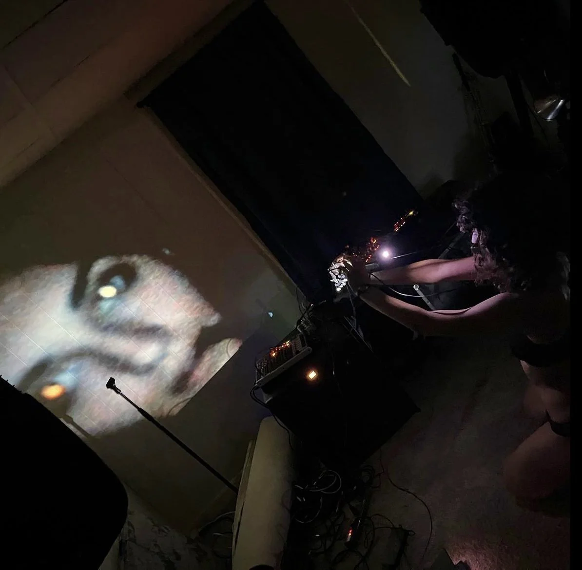 Movement and voice performance with Bluetooth mic and acrylic nails altered with LED lights; movement and voice performance with dress with LED lights, chimes, and bluetooth mics; feedback mixer sound loops with tape player; live endoscope camera feed projected; video art using LED light altered garments and TouchDesigner projected; bowl filled with LED lights